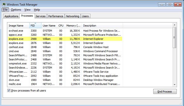 If we look in the "PID" column, we will see our PID of 2988. Then by looking at the "Image Name" and "Description" columns, we can see that out active network connection is Internet Explorer.